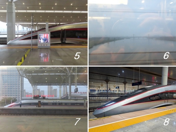 過 徐州後進入 安徽省地界,突然間窗外出現一條大河,是 淮河[圖6],措手不及拍得很糊,我沒想到 淮河的河面如此寬闊。過 淮河緊接著 蚌埠到了,車停 蚌埠南站[圖7],可以看到「淮河文化之都 大禹文化之鄉」的廣告;『蚌埠』我們以前教的發音是『bàng fù』,他們的發音是『 bèng bù』,同樣兩個字唸起來差好多。本來想在長程鐵路補眠,但被精彩的神州大地吸引,沒有一絲睡意,列車上老婆嘗試學習點外賣,選擇在 南京取餐;列車在 南京南站[圖8]停4分鐘,下車伸展筋骨,還是有大媽、大叔在注意有沒有人越過黃色線。