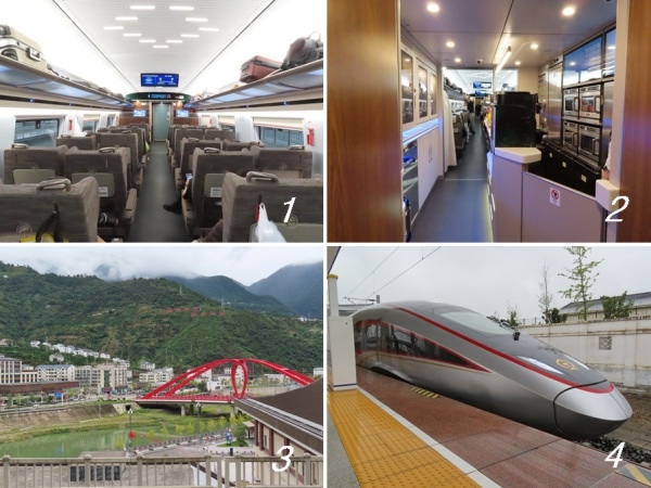 我們不到9點便到達 重慶北站,9:26發車,列車抵達前幾分鐘才開放進月台,想拍列車須搶時間,還好我們搭一等座[圖1],在第一節車廂,讓我有時間慢慢拍[首圖]。早聽說搭長程高鐵便當要早點訂,以免沒東西吃,11點就到第六節餐車[圖2]訂便當,服務員說待會兒送到座位;只有幾位乘客點便當,其他人肚子不餓嗎,原來他們都叫外送,各站停車後不久,服務員就送過來。湖北 宜昌 興山站[圖3],遠方山巒上斗大的紅字「昭君故里 和美興山」,這裡是 王昭君的故鄉。