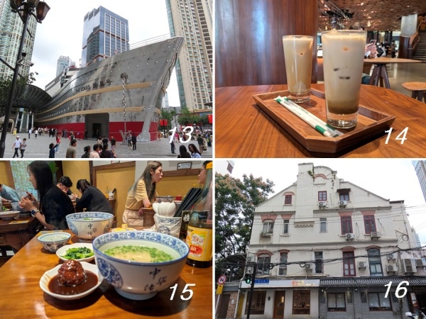 由地鐵「南京西路」站3號出口走出,約100公尺就看到圓形建築「星巴克烘焙坊」[上圖],旁邊是「LV旗艦店」[圖13],位置在南京西路南側的「112人民廣場」角落,兩座地標吸引大量人潮。到這裡已接近中午,進入星巴克烘焙坊想買些麵包當午餐吃,所有品項價格都好貴,不值得,點兩杯咖啡[圖14]喝就好。喝咖啡時間順便在裡面上上下下參觀,沒引起購買慾望,走出 星巴克烘焙坊後往石門二路方向走,到一家稱「十七鋪面館」老本幫麵食,午餐就在這裡用,麵好大一碗[圖15],物超所值。