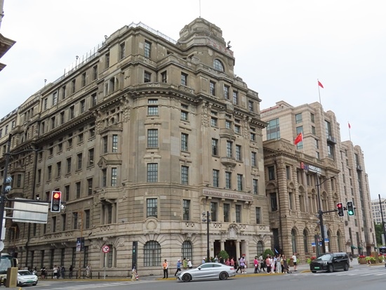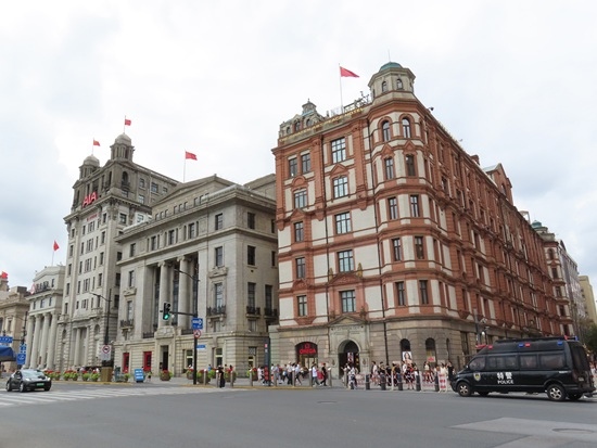 想起來了,上回是出地鐵站後往西走,走到人民廣場那頭,後半段天已黑;上次也有到 外灘,是另一天來的,從地鐵站出來走到 外灘,陰時有雨帶著傘來。這次一樣往 外灘走,[圖17]美崙大樓,有Jordan標誌,記得另一頭有棟老大樓掛著Nike標誌,運動品牌好像很愛進駐這個商圈。[圖18]柱子上掛著「優秀歷史建築」牌子,介紹寫「慈安里大樓」,一樓有多個商家,大部分賣上海特產。再往前走就是 匯中飯店[上圖]和 和平飯店路口,跨過中山東一路就是外灘最著名的「陸家嘴摩天建築群」[上海印象第1張圖],2012年時「東方明珠電視塔」最高,現在被超過了。