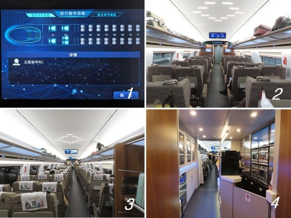 車輛內部座位配置,依長車組與短車組而有不同,長車組16輛和17輛車一列,內部配置不清楚。短車組為8輛車一列,第一節為商務艙與一等座[圖1],商務艙僅有5個座位,採蛋殼式座位;一等座寬1,160mm,以2+2並排[圖2],共32個座位。其餘車廂為二等座,依各節車廂配置,座位數不同,座位寬1,020mm,座位為3+2並排[圖3]。各列車都有餐車,餐車附吧檯,短車組餐車[圖4]一般在第6車,各列車編組會有變動,列車在大站啟動後會廣播。