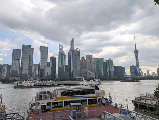 走出「來福士廣場」,前方東大明路的老建築吸引我,於是走過去拍照,上網比對是「南洋兄弟菸草」[圖7],興建於1915年,從這條路往 蘇州河走,後面還有「俄羅斯總領事館」、「上海郵政博物館」、...等經典建築。先往 北外灘(公平路輪渡)走,這裡有另一格角度的「陸家嘴摩天建築」,發現渡輪正駛離[圖8],問一位警察,知渡輪僅駛到對岸,如果是開到 外灘我就搭渡輪回去。突然間滴下雨來,我們回「來福士廣場」避雨,這一折騰近兩小時,蘇州河甭去了,由廣場直接進入地鐵站,搭車離開。