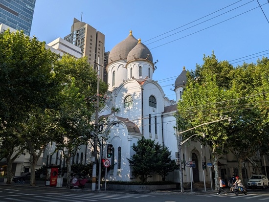 襄陽北路是一條略偏斜的南北向馬路,與長樂路和新樂路交會,與新樂路交叉口西南角就是「東正教堂」[上2圖],昨晚以為是圓頂,白天才知是 拜占庭風格的洋蔥頂。上網查,教堂全名是「罪人之保障聖母主教座堂」,以 聖母瑪利亞為主保,興建於1936年。教堂對面一座豪華洋樓[圖12],是昔日的「三鑫公司」所在地,該公司是洋樓原主人 金廷蓀與 杜月笙、黄金荣、張嘯林合組成立,做煙土買賣生意。襄陽北路底是「襄陽公園」,原為私人庭園,幾經輾轉成為公園,清晨好多居民在運動。