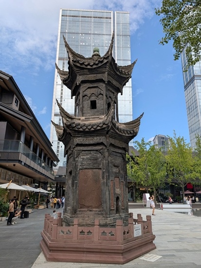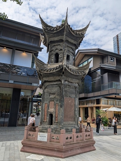 成都 太古里商圈留存著許多 清代、民國時期的老建築,其中 大慈寺大門前的廣場,有一座稱「北糠市街「字庫」」的老遺物。在 成都聽到的「字庫」就是常聽聞是「惜字亭」或「敬字亭」,這趟旅遊在 都江堰的 二王廟「大殿」前也有兩座,導覽老師說:『這是惜字亭,也稱為字庫塔,就是......。』。很明顯 四川人也使用「惜字亭」來稱呼焚燒字紙的『爐』,只是多了一個更貼切的稱呼「字庫」。