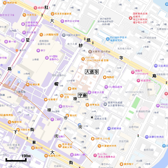 「字庫」的位置在 太古里商圈核心位置,上面地圖十字形的「糠市街」,以『字』為中心分東、西、南、北四條糠市街,其中北糠市街在太古里商圈徒步區內,其他東、西、南糠市街是車輛行走道路。地圖中紗帽街、紅星路間就是春熙路商圈的範圍,「春熙路」是街道名稱也是地名,小區域「春熙路」即上述區域及再往西達兩條街的商圈,大區域的「春熙路徒步區」還包括東側的 太古里及更西邊地圖以外範圍。