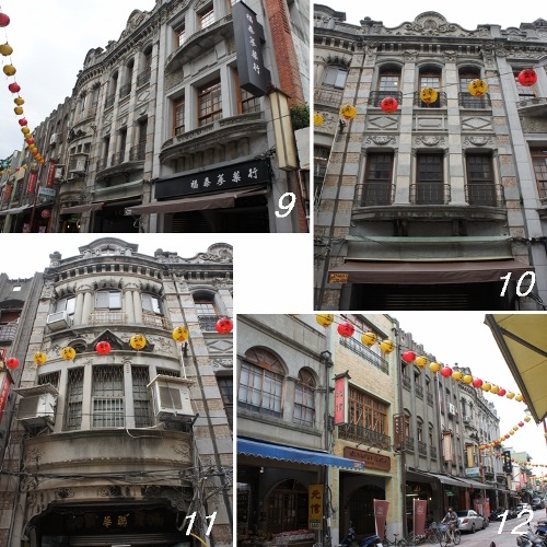 [圖10]150號為三棟 巴洛克三層街屋中間,頂上圓形山牆有巨大貝殼狀裝飾,中央有勳章裝飾。壁柱採灰白相間,二樓方窗,兩邊設圓形壁柱,較為特殊。[圖11]148號二、三樓立面弧形突出於一樓,為整個迪化街最突出的建築,1946年聯華食品 李國衡向 李春生家族承租這棟街屋創業,1949年買下這棟起家厝,至今 聯華食品仍有部門設於此。[圖12]繼續連過來,146、144連棟算是現代主義樣式吧,142號建於1912年,於1960年改建現代建築立面,這幾座內面保存大量木造結構,精采絕倫。