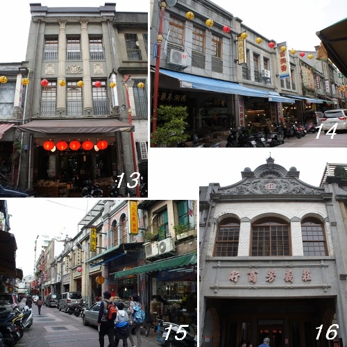 回頭看雙號邊,140為雙層樓,第二進才是三層外,接著三棟都是連棟的三層樓街屋,其中134號[圖13]樣式類似保安街上的「順天外科醫院」是同樣模式。之後到民生西路口之前都是雙層街屋[圖14],路口兩邊是近似144、146號的三層樓街屋。中街起頭的單號邊[圖15]也都是雙層樓現代主義街屋,其中「莊義芳商行」[圖16]有 巴洛克式山頭,嵌上『莊』字姓氏,這模式的建物應該是 明治末到 大正年間的房子。