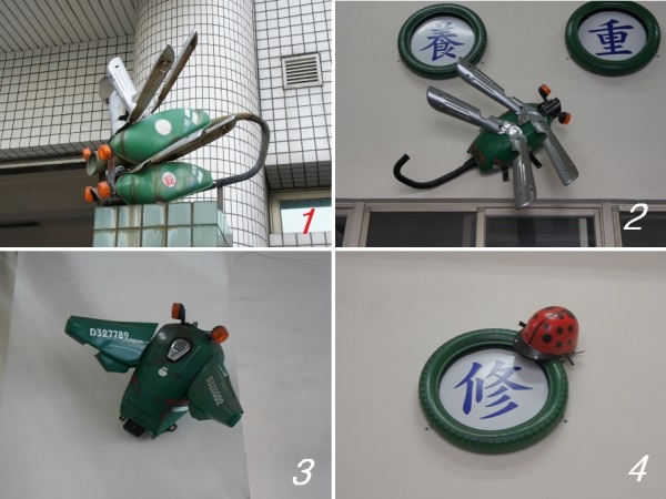 發現門柱內保修廠有更多“昆蟲”,先徵得同意再進入拍攝,牆壁上除了外頭很多的 蜻蜓[圖2]外,另有以機車油箱殼和側蓋組裝的 金龜子[圖3],還有安全帽彩繪的 瓢蟲[圖4],口號「保養重於修理」六個字外圍以外胎框起,旁邊搭配昆蟲,巧的是保修廠中另外的 金龜子和 瓢蟲也是我喜愛的昆蟲。很有趣的巧思,路過時不妨停下腳步,或許還有更多“昆蟲”藏匿其中。