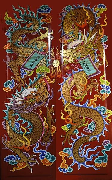 將「台灣的門神---龍」內容作調整,將出現於 上帝公廟、五穀王廟及其他廟宇的 龍門神另編輯這一篇「台灣的門神---龍(二)」。原因是祂們與 媽祖廟的 龍門神多少有些差別。媽祖廟的 龍門神底板多採用朱紅色,上帝公廟則多以深赭色等暗色系為主,黑底的效果更顯出『龍』的氣勢。台南 北極殿三川殿明間這組 龍門神[圖1],由 府城彩繪名家 潘麗水先生所作,應該是 台灣最出色的一組 龍門神。