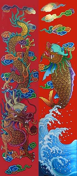 繼續來看[圖5]這幅不一樣的雙龍門神,位於 台北市延平北路2段61巷內的 真聖堂是座小巧的廟宇,廟址原供俸 文昌帝君,是 大稻埕文人雅士聚集研讀漢學、吟詩、勸善之聚所。大正14年(1925年) 徐(漢深)純青先生,自 板橋 新埔「接源堂」恭請 呂仙祖祭祀,成了 呂祖廟(仙公廟)。民國90年(2001年)改建,新的彩繪門神為雙龍,但左(面對右)側之龍採「鯉躍龍門」的龍首魚身,就是一般稱的鰲魚,非常有意思。