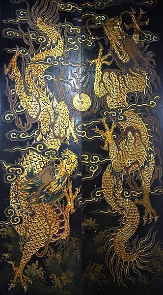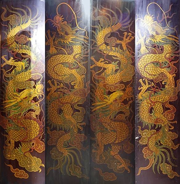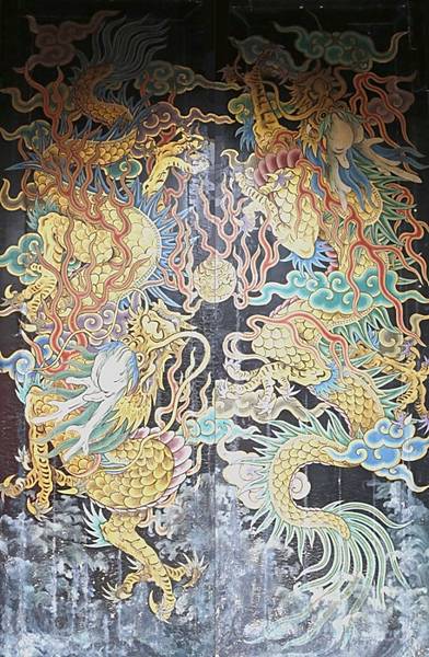 [圖4]這一幅龍門神也是 五穀王廟出現的,祂的 雙龍旁佈滿雲朵,一樣是一對在雲間的雙龍。俗語:「雲從龍,風從虎。」,“雲”與“龍”關係密切,而降雨又與雲層有關。這幅門神是 士林 神農宮二樓 神農殿中門的門神,兩條龍頭部反向,是比較特殊的。神農大帝庇佑五穀豐收,民間信仰降雨多寡由 龍王執行,五穀王廟會出現以 龍為主的門神,有其特別含意,祈求雨水豐富、五穀豐收。先民開墾首重豐收,唭哩岸 慈生宮、士林 神農宮、二重 先嗇宮和 枋寮 福和宮四間 五穀王廟,在 大台北地區都是名列前茅的老廟。