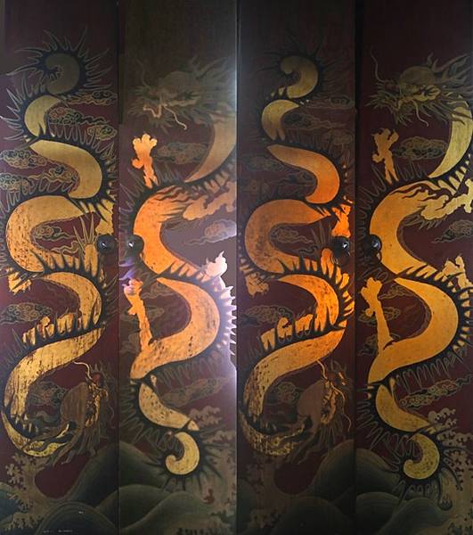 後龍 正天府 張天師道觀也有位於次間,左右各一組的雙龍門神[圖7],見到祂一樣如同遇到寶,是目前北部個人唯一遇到的一組。後龍 正天府在縱貫(海線)鐵路邊,為了找 火車的拍攝點,見到規模頗大的 正天府,自然入內參拜。時間接近黃昏,廟埕刺眼屋內很暗,見 三川殿門神為常見的 秦瓊、尉遲恭,勉強拍下。走入大殿,見到明間 三十六天罡、次間兩對金龍,太少見了,再困難也硬拍下來,辛苦後製下留下這幅畫作。