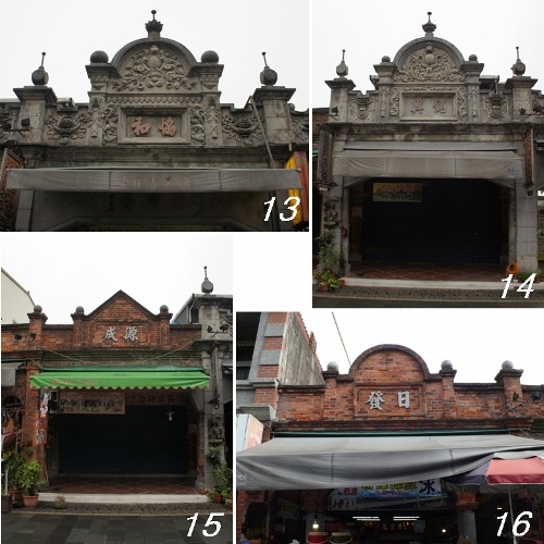 旁邊的47號[圖1]是簡易三角楣山頭,店號沒有嵌於山頭,而是將「進興商行」四個字擺放在騎樓上方的牆面。49[圖2]和51號[圖3]連著兩棟,依牆面字樣都是「再生堂藥行」店面,立面上分別為「再生」和「源隆」,標示著“己未年”,正是 大正8年(1919年)老街立面完成年分;兩棟山頭上的雕飾皆採西洋式雕花,也就是俗稱的 番仔花或 西洋花,三角楣立面上皆有俗稱 鮑魚的勳章雕飾,這裡出過 部長 簡又新。53號[圖4]是「順興」,山頭風格似格壁的「再生興源隆」兩戶,其上繡面無雕飾。