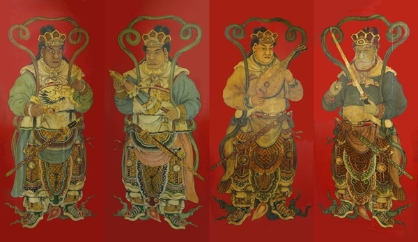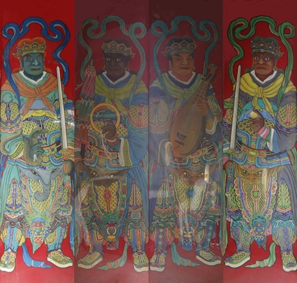 [圖1]士林 惠濟宮 三川殿門神組,四大天王依“風”、“調”、“雨”、“順”排列,以使用兵器代表性象徵,“劍”意思是鋒利如風、“琵琶”音調諧音同調、“傘”自然聯想到雨、“纏蛇或龍或貂”表示順的意思,這,「劍」、「琵琶」、「傘」、「“虫、獸”」幾乎已成 四大天王門神模式圖像。另外注意這組畫作 天王們腳下踩著的“天邪鬼”,“天邪鬼”表示無論如何教導、懲戒也不肯向善的鬼,只有踩在腳底下才能阻止它作怪。在 中國、韓國、日本佛寺中,四大天王塑像腳下常踩著 天邪鬼,台灣早期塑像也有,近年 天邪鬼消失;目前所見門神的 四大天王彩繪,腳底下很少踩著 天邪鬼,這組是少見的例子。