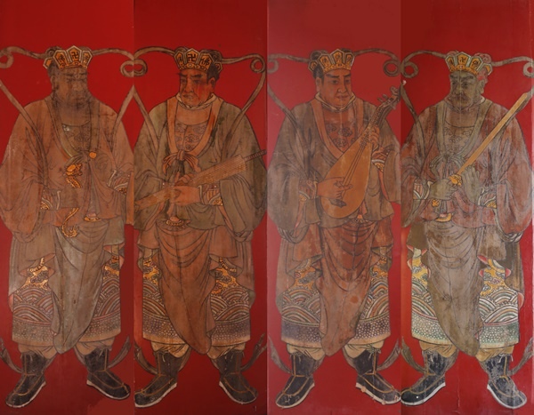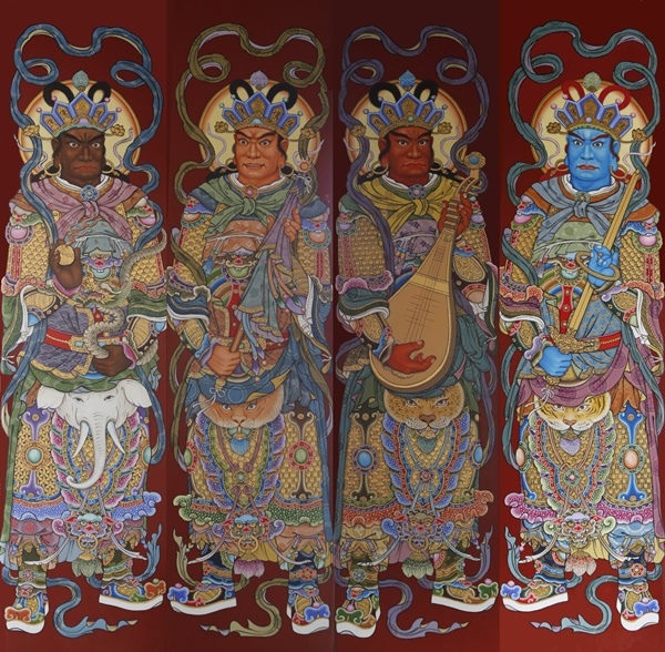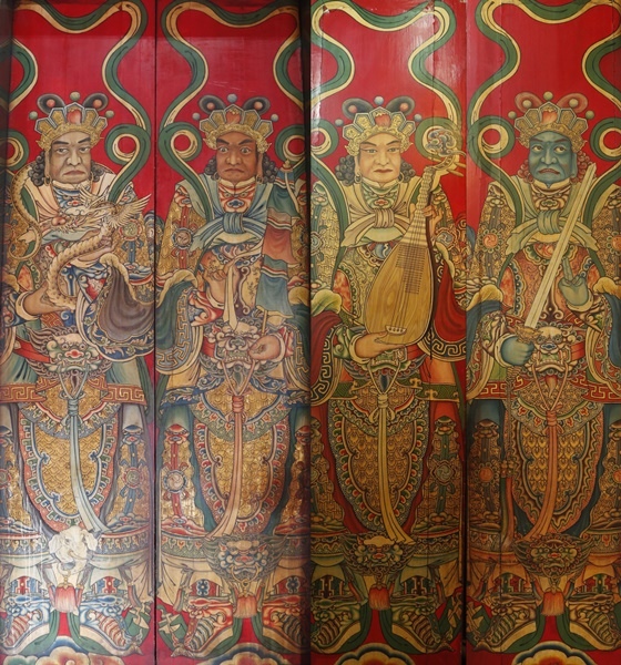 [圖2]是台北 醒心宮的 四大天王門神。醒心宮與 行天宮系出同門 ,由 陳清波居士擲筊迎請其中 恩主「孚佑帝君」為主祀,於 民國42年(1953年)成立扶鸞道壇。67年(1978年)覓地建3+1層樓廟宇,新建築坐落於迪化街巷弄內,立面狹窄,中門(主門)雙扇,旁邊龍、虎兩門為單扇門板。四天王門神分別為2樓「三聖寶殿」兩側單扇的“風”、“調”兩位天王,以及3樓「瑤池寶殿」兩邊單扇“雨”、“順”兩位門神,所以組合起來變得很寬。醒心宮的門神組除一樓中門是 淡水 莊文星先生作品外,其餘皆出自 鹿港 郭佛賜先生所繪,是 郭先生晚期最精美、細緻的作品,完成後讓觀者讚嘆,是廟宇之寶。