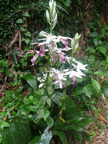 特徵:地生蘭,植物體開花時高可達100cm,叢生;假球莖卵形,包覆於葉內,不明顯。葉,紙質,表面折曲狀;3~5片,長50~80cm,寬10~15cm。花軸由假球莖抽出,粗壯、直立;總狀花序,花朵數多達10餘朵。花,徑5~7cm,有短 距;萼瓣與 花瓣外側白色,內側赭紅色;唇瓣白色,喇叭型,唇盤具2條龍骨。蒴果長3~5cm,六稜。