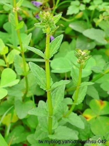 特徵:多年生草本,株高15~35cm。莖,無毛,四方形;綠色,邊常帶暗紫色或棕色。葉,對生,三角卵形至卵形,長0.8~1.5cm、寬0.5~1.2cm,基部截形至鈍形,葉鋸齒緣,上方葉亦多少具疏齒,兩面無毛;葉柄明顯。花,單生上部葉腋,常兩側各一,花萼裂片鈍或圓;花冠二唇形,淡紅紫色至藍紫色,長約1.2cm,被毛。果,扁球形,淺棕色。