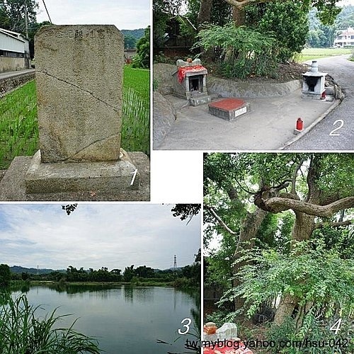 三合院規模不小,有三座護龍,應該是此地的大戶人家;建築外觀嶄新,看得出剛修繕完成左外護龍尚有鐵皮支架,仍在維修中。三合院周邊始終沒看到居民,不便冒然進內,僅拍幾張外貌;隨後到附近稻田間四處走,臨山腳有座埤塘,115公路旁及另一側另有兩座[圖3],看到學生騎腳踏車帶著釣竿來垂釣,眼前的景象彷彿似曾相識,卻又陌生。