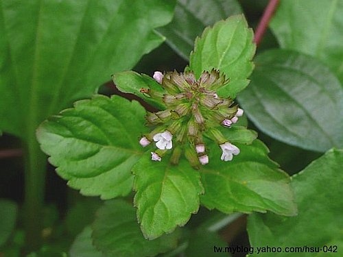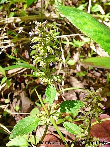 特徵:一年生或多年生草本,高約30cm。莖直立,細長。葉,卵形至廣卵形,鋸齒緣;兩面無毛,僅脈上疏被短毛;基部圓形或截形,葉柄長5~10 mm。輪繖花序,隨著生長一節一節輪繖花序疏離於總花梗上;花冠白色或紫紅色。果,堅果,近球形。