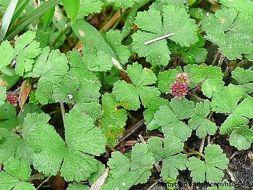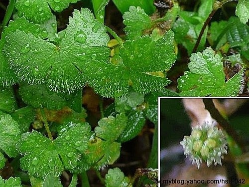 特徵:多年生草本,莖匍匐貼地,節處生根。葉圓腎形,寬1~3cm,被白色粗毛;3~5深掌裂,裂片深約2/3,倒卵形,鈍鋸齒緣。葉柄被毛,長2~10cm。繖形花序,花朵多數,花白色;處向陽處萼瓣易泛紅。離果寬約1.3mm。