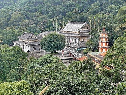 由一線天出口俯瞰 圓通禪寺,牛埔連峰稜線上大廟為 上寶禪寺