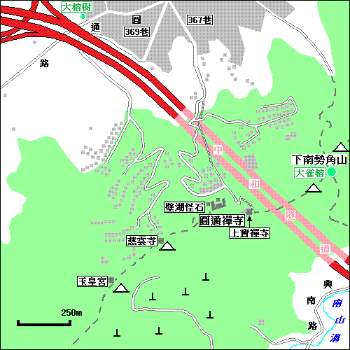 圓通禪寺:台北縣中和寺圓通路367巷64號,圖中淺綠色部份為約略海拔50m以上範圍。