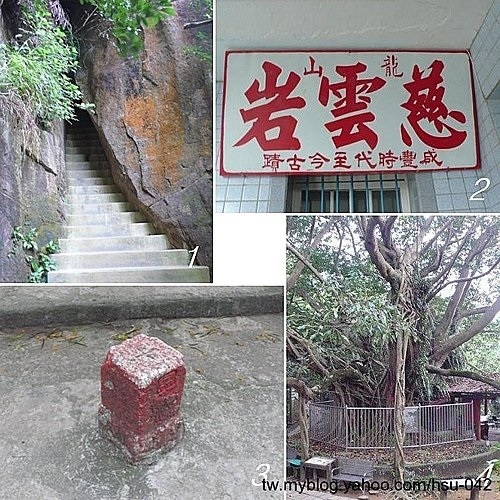 穿過 一線天接上寬大步道,此步道主線為 台北縣政府步道系統,另有民眾走出的稜線路徑;牛埔連峰大小山頭多被好事者取了名字,記也記不起來;總之路徑清晰,四通八達,選寬大路徑不會有迷途之慮。我先往右(西南)走稜線路徑越過兩個小山頭,下「玉皇宮」;此去若再往前無明顯標的,因此回頭走步道系統往東北方向。步道會經過「慈雲寺」[圖2],慈雲寺是座歷史相當久遠的 觀音廟,但在 咸豐年間「漳泉械鬥」時香火被“接”到 板橋成為「接雲寺」;今日的 慈雲寺為光復後由 圓通寺支援興建的寺院。