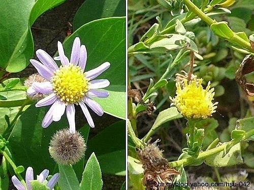 總苞半球形呈碗狀,苞片2、3層。頭花直徑2.5~4cm。舌狀花(邊花)花冠淡紫色,筒狀花(心花)花冠黃色[上圖];有些族群缺舌狀花,頭花呈現黃色半球形狀[下圖]。瘦果倒卵形,冠毛兩型,舌狀花白色,筒狀花褐色。
