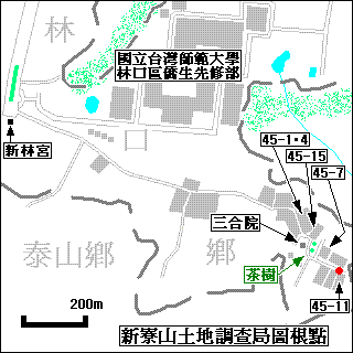 新寮山:海拔246m,在工廠門前的馬路鐵蓋下。這顆我以前沒找到,這次照著 brownlee兄紀錄一步一步來:下交流道由 林口 文化一路往 林口舊市區行,在 仁愛路右轉後一路直行,大馬路到底旁邊是「國立臺灣師範大學」大門,就是以前的「僑大先修班」。過大門後圍牆與 土地公廟(新林宮)間的小車道(新林路)進入,一路循主線行,接近路底時道路變得較寬敞,此處右有三合院、左有種著 茶樹的空地[圖2];依照片中馬路左轉後,經過數棟鐵皮工廠,見到「新寮路45-11」號,在大門前方有個約兩尺的鐵蓋,基石就在裡面,需搬開數塊石頭才見得到[圖1]。