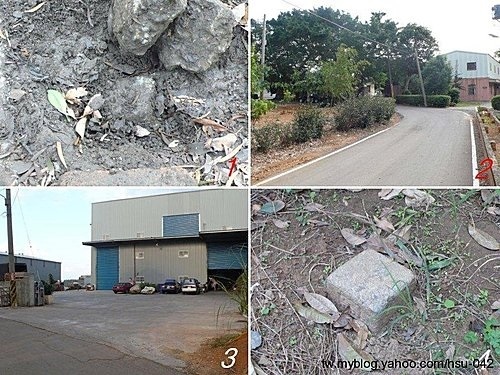 菁埔山:海拔220m,一樣是台地無明顯高點,一度因整地面臨消失窘境。回 文化一路大馬路續往北行,接往 八里的105縣道(中湖路);約1km多轉入 北78鄉道(菁埔路),有明顯道路指標,路口有一間裝著鋁門窗的 有應公廟。接著就完全依照 brownlee兄紀錄,過路右 北78「1k」里程標示牌不久至 菁埔路39號 右轉小路;行1.2公路見石雕工廠停車,找電桿「寶斗幹28」,前方一間頗大鐵皮工廠[圖3],基石就在照片中三輛車子間的大石頭(花圃)內。兩顆基石並立,一顆為「林口T-14」,另一顆就是 土地調查局圖根點[圖4]了。