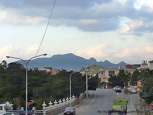 林口市區遠望 觀音山群峰,最高點為 觀音山,右邊凸起為 崩山,接著是 鷹仔尖、占山...等等;左邊為 牛港稜山,照片不夠清晰,看起來像是 觀音山的稜線。