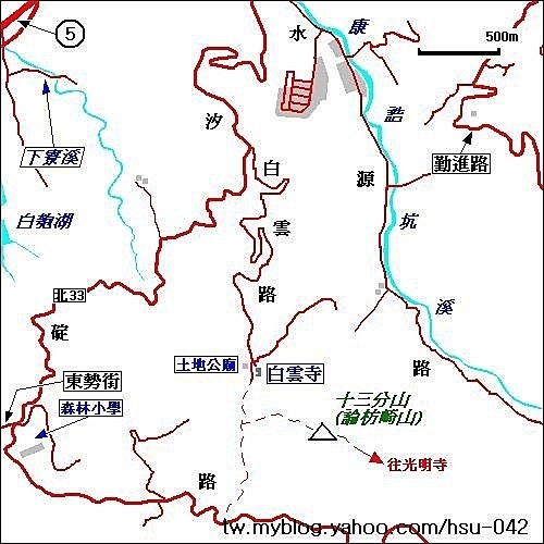 早上貪睡不想早起,晚上又要參加喜宴,看來今天沒什麼地方可去了;想到登山前輩們 北聯隊.小天下.藍天隊.崇稜隊的一則紀錄,就選這座吧。汐止的 十三分山,又稱 論枋綺山,海拔483m,土地調查局圖根點;平常山路雜草叢生、芒草掩徑,雖路程短但不好惹,利用山徑剛清理不久,可趁機撿便宜。