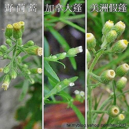 三種 假蓬屬(CONYZA) 頭花比較,野茼蒿與 加拿大蓬為 奶瓶狀;美洲假蓬是短筒狀,頭花直徑大上一圈,區分還算容易。