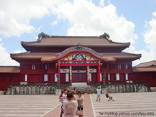 團體行程的旅客早上8點半左右開始下船,這時我們還在自助餐廳吃早餐,待準備妥當下船時已經9點多。叫了兩部計程車直接往「首里城」出發,約好在「守礼門」[上圖]會合;在車上司機訝異於 老爸的日語,直說 沖繩人也發不出這麼標準的日語云云,和 老爸聊開了。結果司機聊到開過頭,害我們的車資比另一部貴上近兩百元。「守禮門」曾經聲名大噪,1972年 美軍結束託管 琉球,琉球人投票的結果,加入 日本成為 沖繩縣;發行廿幾年的『琉球郵便』從此停用,郵商伺機炒作,其中1958年發行的《守禮門復元紀念》郵票飆漲最兇,守禮門因此成為全日本知名景點。另外 守禮門也是 日圓流通貨幣2000円券的主要圖案。