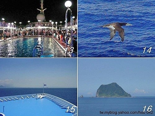 接近 台灣海域(手機能通),一大群海鷗[圖14]跟隨郵輪飛翔,至少有2~3 種;意外地 海豚群也來湊熱鬧,只要一躍出海面,總能引起一陣歡呼。看到陸地了[圖15],旗子下方海平面上的小灰點是 「基隆嶼」,最左邊的山巒是 「基隆山」。漸漸地船駛過「基隆嶼」[圖16]準備入港;爭先恐後民族性的 台灣人大部分消失在甲板上,急著打點行囊排隊等下船;只餘少數人繼續留在甲板上欣賞 基隆港美景。