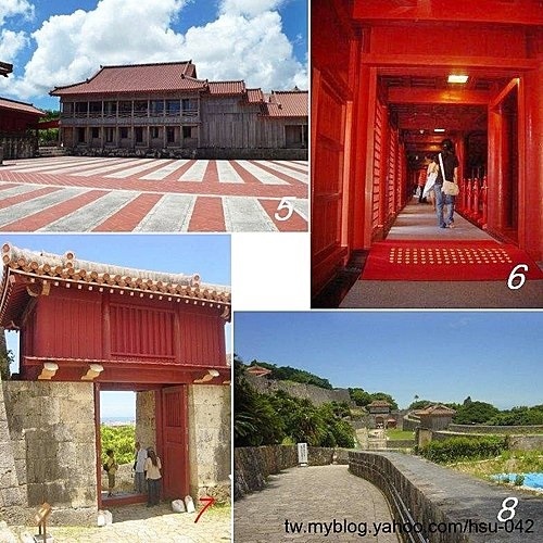 由「南殿」經過「左掖門」[圖6] 進入「正殿」,正殿內復原昔日格局,頗有看頭。由 正殿轉入 北殿,內部有紀念品販售商店,我買了一本《首里城 甦る琉球王國》,否則哪記得上面這些『門』、『殿』的名字和功能。再由 北殿出「右掖門」[圖7] 離開收費範圍。[圖8]是 右掖門步道上拍的,對面是進城的 歡會門,較近的門 為「久慶門」,規劃路線不得在“內城”循環,需由 久慶門出去。光看我敘述可能會暈頭轉向,放心啦!內部指標明確,幾乎每個轉折點都有穿傳統琉球服飾的工作人員服務,想“走錯”很難。
