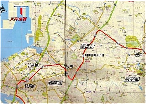「おきなわ屋」無料情報誌掃描下的 沖繩市地圖,圖左上角是郵輪停靠位置,紅色線即單軌列車線路。