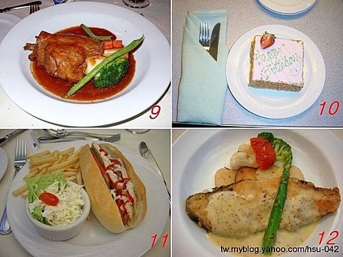 現在來談談「天秤星號」吧!排水量達4萬2千多噸,長 216.4公尺、寬 28.4公尺,樓高達9層(甲板10層)。算是相當大的郵輪。內部主要有三家餐廳,分別為四樓的 四季餐廳(西餐)、海華宮(中餐) ,九樓的 航海家自助餐廳。另外還有 酒吧、劇院、夜總會、賭場...等等奢華的場所以及 游泳池、按摩池、健身中心等休閒設施。可點選 麗星郵輪 「天秤星號」參考。這裡僅貼出 四季餐廳的幾道菜...[圖9]羊腿排,[圖10]送到房間的生日蛋糕(大兒子),[圖11]雞肉三明治,[圖12]魚排。海華宮的中餐是合菜,沒提供單點,自助餐則是每日不同主題菜色。