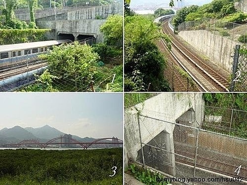 退回「多叉路口」走向台北縣市交界處,往『知行路』走下去,有階梯可以下往鐵路邊,這裡可以清楚的看到淡水河、關渡大橋及隧道北口來往的列車[圖2]。繼續順著樓梯往下走,原來是一座公園---觀海公園,真不知名字是怎麼取的,這裡怎麼樣也看不見『海』,是『河』吧。不過這裡還真是美,公園一直延伸到河岸「自行車道」,[圖3]水筆仔、關渡大橋、觀音山......真的是一處值得一遊的公園。問題還沒解決,從這裡無法知道捷運局怎麼看待這個“涵洞”。回「多叉路口」從公路邊的小缺口下去, [圖4]看清楚了,牆壁上貼一個小牌子『←台北市 台北縣→』,終於了解『它』只是個“涵洞”,關渡隧道和淡水線鐵路一樣,在1988年(民國七十七年)已經走入歷史。
